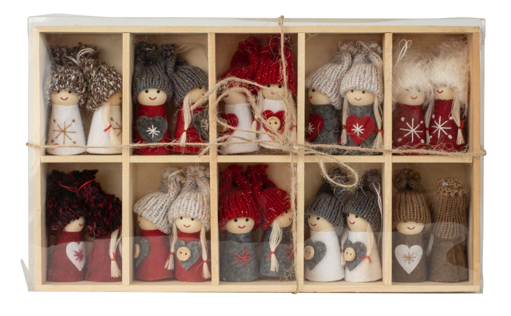 De kerstpoppetjes hebben een hoogte van 6 cm en worden geleverd in een handige houten opbergdoos. Ze zijn gemaakt van hoogwaardig hout en met zorg geverfd in warme, feestelijke tinten. De set is 10-maal geassorteerd, wat zorgt voor een speels en gevarieerd geheel.