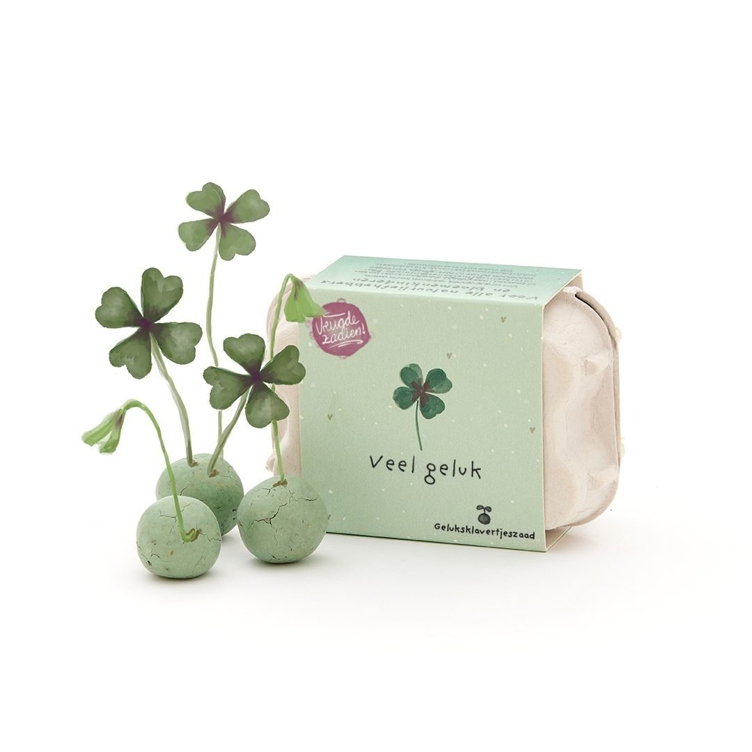 Wens iemand op een originele manier veel geluk met deze schattige klavertjes in een mini eierdoosje. De groene bloemvormige knikkers bevatten klaverzaadjes die je eenvoudig kunt planten. Met een beetje water en aandacht groeit er vanzelf een decoratief klavertje – een mooi symbool van geluk en groei.